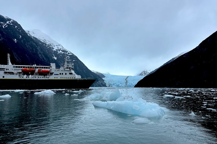 Before lunch, we entered the western end of Seno (Fjord) Agostini and began making our way about 30 nautical miles (50 km) towards the head of the fjord. We could see numerous glaciers along the south side as we sailed deeper into the narrow waterway. Nearby mountains reach more than 3,300 feet (1,000 meters) on south side, and more than 6,600 feet (2,000 meters) on the north side. Our ship reached the head of Agostini Fjord, where we found the terminal end, or tongue, of an impressive terrestrial glacier. This active glacier showed a lot of beautiful deep blue colors within the crevasses near the shoreline. It is obvious that in the recent past, this was a tide water glacier, but now the ice face breaks off mostly along the shoreline. While the ship drifted (the water in this fjord is too deep for us to anchor), most of us went out on a Zodiac excursion to get close-up views of the floating brash ice and bergy bits and watch a continuous process of glacial calving in one area of the glacial face. An unexpected highlight of the excursion was the arrival of a large leopard seal swimming sleekly around the chunks of ice and occasionally approaching various Zodiacs for a closer look. We also admired the exposed shoreline walls of convoluted metamorphosed rock, with complex quartz intrusions crisscrossing throughout. There were numerous water cascades and water falls pouring down from the melting snow banks, and of course, rain runoff. It was no less scenic and impressive when we made our way out of Agostini Fjord, especially when we poked into a side fjord along the way.