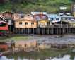 Once our time in the cultural center was complete, we made our way a short distance to the Big House of Alert Bay. The day had warmed just a little with continued gorgeous blue skies. From intense bright sunlight we entered the other worldly atmosphere of the Big House. A roaring fire was blazing in the center of the room, sending smoke up through the smoke hole in the roof of the building. We were greeted and welcomed by elders and several young people, all members of the T’sasala Cultural Group. During the next hour explanation was given about the Potlatch itself, the young people performing and the significance of each phase of a Potlatch. The final song was a fun dance and many of us enjoyed an opportunity to dance around a fire in the Big House. The dancers, drummers and elders fell into a line to thank us for taking the time to visit their community and participate in cultural traditions just outside of our own lives. Today that bridge was crossed; each group learning just a little more about each other. A gift that only brings smiles and warm moments in reflection. As the final thank you was being exchanged, a seafood buffet was being laid out on tables in front of the drum log! As we lined up for lunch, we saw the bounty of this land being presented only affirming those foundations of a strong and rich culture. Wild salmon in three different dishes, clam fritters, deep fried halibut, eulachon or candle fish battered and fried, steamed prawns, steamed fresh crab, banoc or fry bread with homemade jams, steamed rice and three different salads! What a feast, as is the tradition in the Big House. Sadly, it was time to begin our walk back through town to our docked vessel. Slight wispy clouds were forming in the sky, but it was still a lovely fall day in the Pacific Northwest.