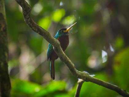 Here we went on an exploration through the forest, bird watching and learning about the various plants. As part of this hike, the longer walkers eventually got to a series of swinging suspension bridges that took us through the forest about midway up into the canopy, enabling us to really get a feel for the forest by being truly in the center of it. One highlight of the hike was a wonderful view of yellow-billed jacamars. They look like a giant hummingbird, due to their long bill, but they are much more closely related to kingfishers. This pair was busy catching flies and then returning to the same perch. Another bird that we all heard but only a persistent few were able to see was the screaming piha. It lived up to its name by being the loudest sound we could hear for our entire walk across the suspension bridge. In coloration it was fairly cryptic with its gray color blending in well with the leafy branches it called from. But their screams (there were several calling at once) announced their presence to the rest of the forest. Though, since it is the males that do the screaming, the only ears they were likely hoping to reach were any female screaming pihas within earshot.