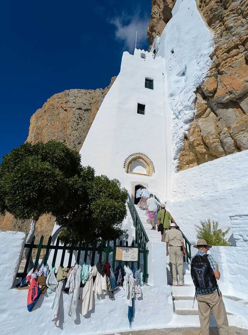 Last night was calm as we were sheltered away from the strong Meltemi winds that have been following us the last days. The bay of Katapola at Amorgos Island is known for being one of the safest harbors in the Aegean! Early this morning we boarded the motor coaches and drove to the east side of Amorgos to visit the 11th century Monastery of Hozoviotissa. This monastery offers breathtaking views as it is glued on the steep cliffs and the only access is by hiking up roughly 300 steps.