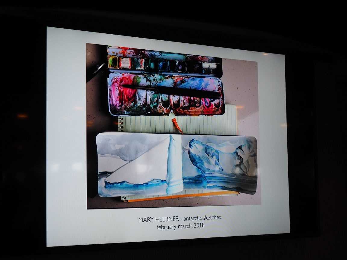 Mary Heebner began the sea day by offering an artist’s perspective on the voyage through her sketches and watercolors. She is the wife of National Geographic Photographer Macduff Everton, and since 1988 they have collaborated on sharing stories and beauty from around the globe. Working from a small, cold-pressed paper notebook and travel watercolor set, Mary spent hours by a window in the lounge creating a body of artistic work that may become a larger series, or perhaps a signature handmade letter press book including her art, thoughts, and lecture notes from the trip.