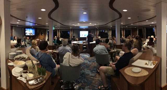 As we repositioned our ship while we passed next to a chain of volcanoes. Meanwhile our naturalist Salvador Cazar makes his presentation about Charles Darwin and the Galapagos Islands.