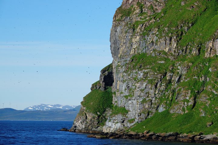 The day began with a flurry of fulmars, puffins and gannets wheeling on the sharp, fresh winds that scoured the land in front of us, whipping up dust and waves alike. Thousands of common guillemots flew by the ship in an endless stream.