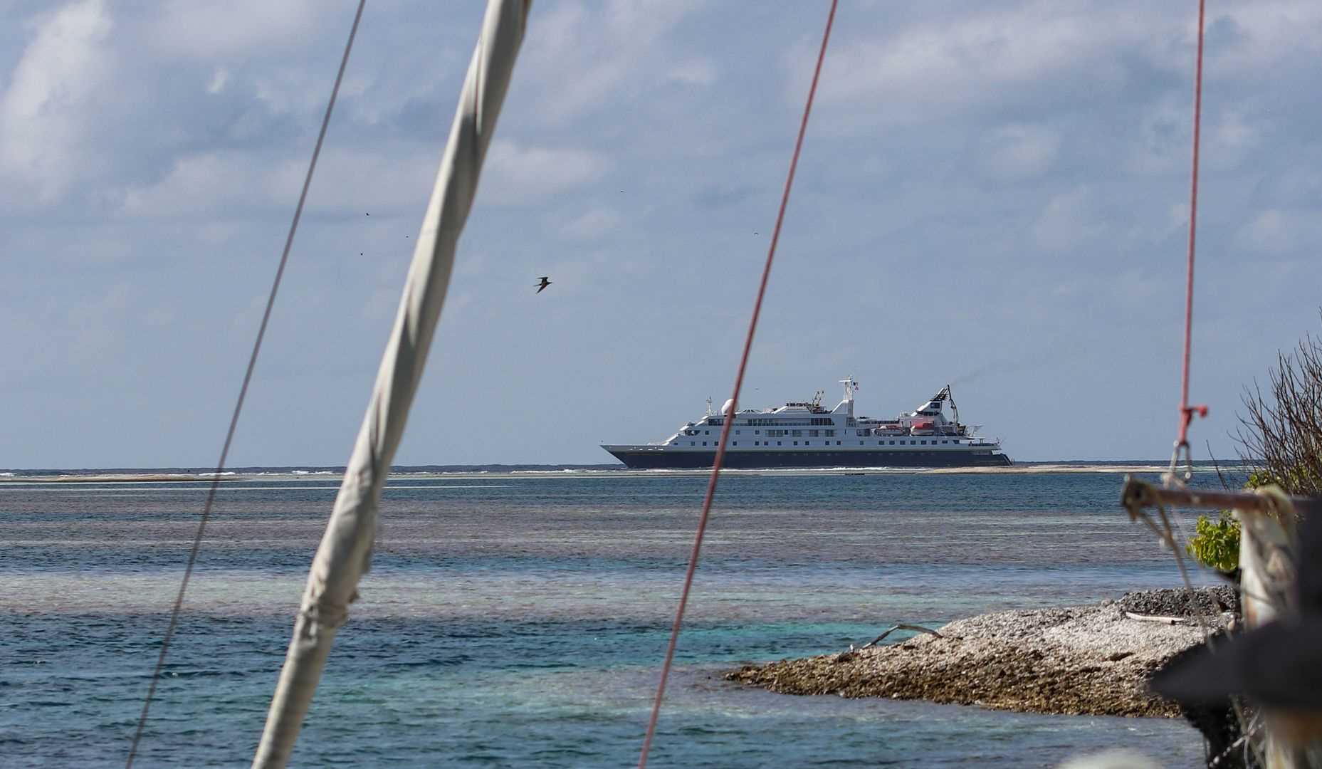 Eyebrows were raised, a three-hour tour to the inner lagoon, over corals covered by mere inches of water? As the tide began to rise, our zodiacs carefully weaved their way through the maze of the coral atoll’s inner webbing of shallow coralline pinks surrounded in turquoise blues. Cautious navigations were well worth the journey- we found ourselves at the wreckage from the sole inhabitant of Millenium Atoll, the sky filled with magnificently soaring birds. Though the castaway that used to inhabit the small yacht and little shack left on the beach was all by himself, one could immediately see the appeal of such a life. Fairy terns, frigates, and not one, but three (of the seven in the whole world) species of boobies were gliding effortlessly above us. Not only were we able to relish in the company of these winged beauties, but we were also treated to some delicious ice cream upon landing. As much as I love diving in the rich seas here, it sure would be difficult to enjoy the underwater wildlife while indulging in sumptuous chocolate simultaneously… challenge accepted none the less!