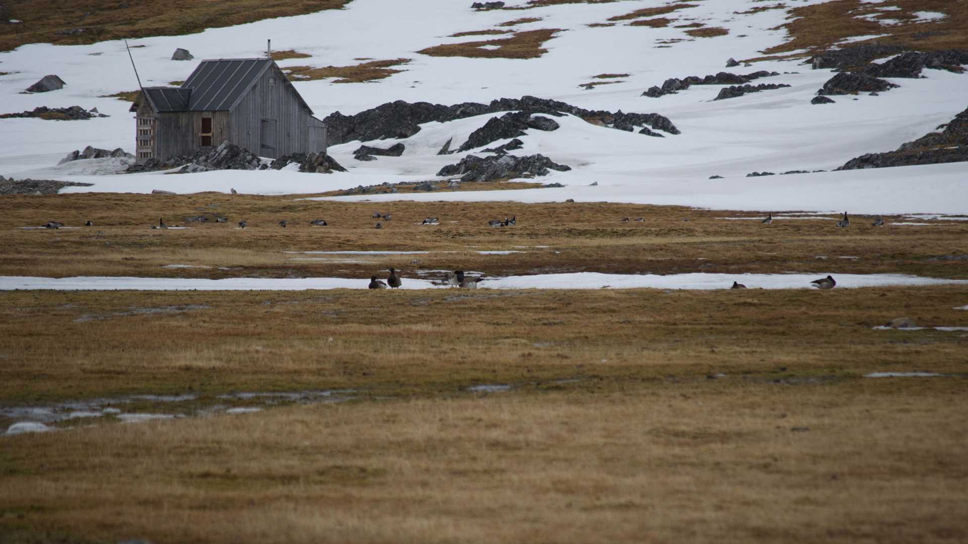 To greet us just by the landing site, many Svalbard reindeer - the smallest of all species of reindeer and a key species for the tundra, were grazing on sparse vegetation. We walked from the beach, to snow, and the beginning of tundra that is starting to show up in between the melting ice. As we walk through this beautiful landscape the only singing bird in Svalbard, the snow buntings, sounds a beautiful melody.