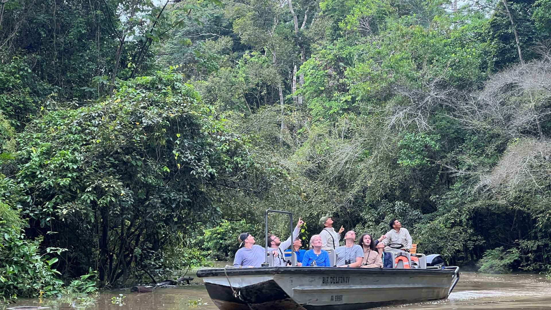 It was an overcast morning when we explored a lovely tributary of the Ucayali River, Belluda Creek. All geared up on the skiffs, we left Delfin II, eager to see what nature had in store during this pre-breakfast exploration. Nature gave us lovely sightings of colorful birds, and we met several locals heading out for their morning activities.