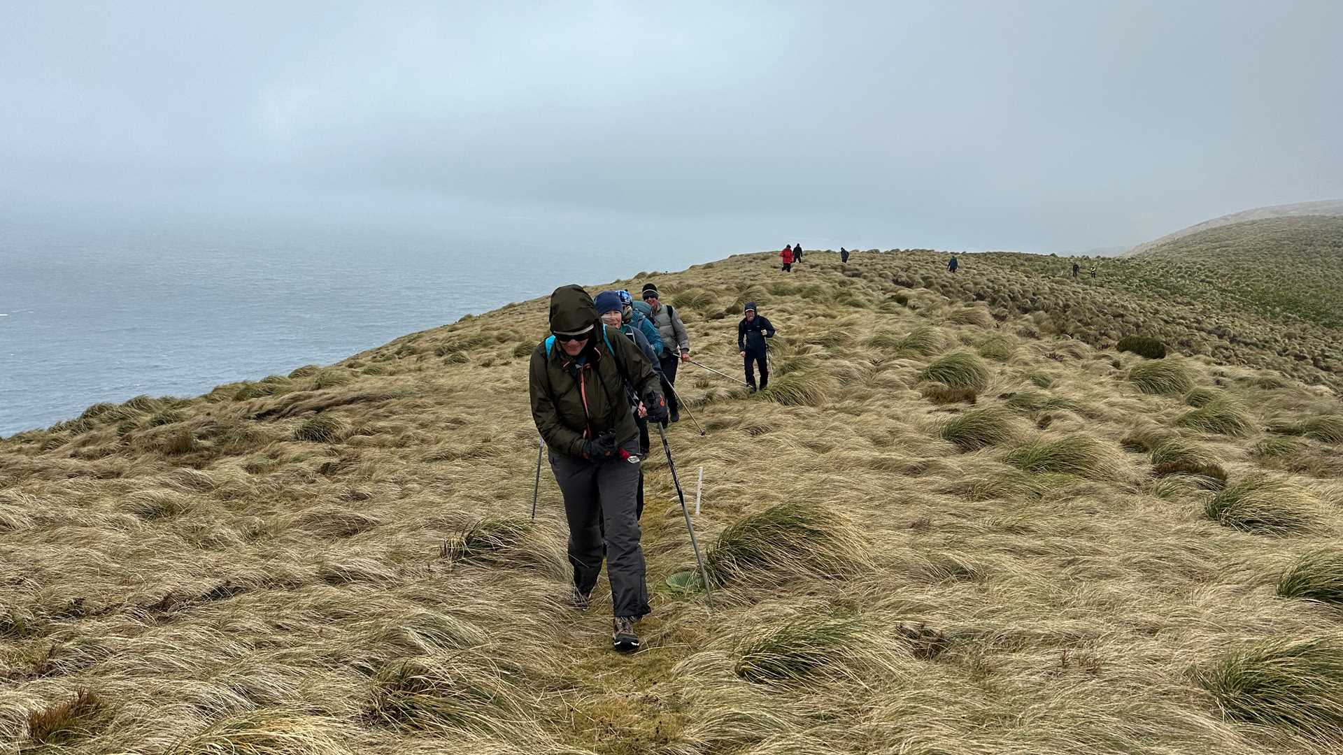 Amongst the clouds of midmorning, we arrived in Perseverance Harbour, the flooded crater of the once active volcanic caldera of Campbell Island. The island had a brooding feeling with a fierce wind sweeping over the tussocked hills. On board, we were busy breakfasting and completing biosecurity precautions to prevent contamination of the local flora and fauna. Our guests diverged with one group taking a long walk to the other side of the island, while the other group took a shorter walk followed by a Zodiac cruise to view the harbour’s amazing natural and historical features.