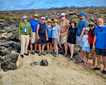 After breakfast, we did water activities. The snorkeling was spectacular, for our guests spotted sharks, manta rays, and other marine life around the turquoise bay of Chinese Hat Islet. The glass-bottom boaters also enjoyed the journey. In the afternoon, we moved to Sullivan Bay on Santiago Island. We walked on a pahoehoe lava field to learn about the geology of Galapagos. The lava is a magical natural museum in front of our eyes. While riding in the Zodiacs on our way back to the ship, we found a flock of penguins and some blue-footed boobies; those sightings were the frosting on the cake for an astonishing day exploring the Galapagos Islands.