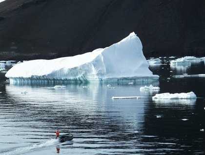 So, Zodiac tours became the order of the morning, taking the guests on trips amongst the icebergs. There were many Adélie penguins swimming and leaping on and off the ice. Tiny Wilson’s petrels could be seen flitting here and there. Their large cousins, the giant petrels were resting on the flows, as the calm conditions were not so suitable for flying. Only one seal was in evidence all morning—a Weddel seal, lying motionless on a large sea-ice flow, which was further out in the bay.