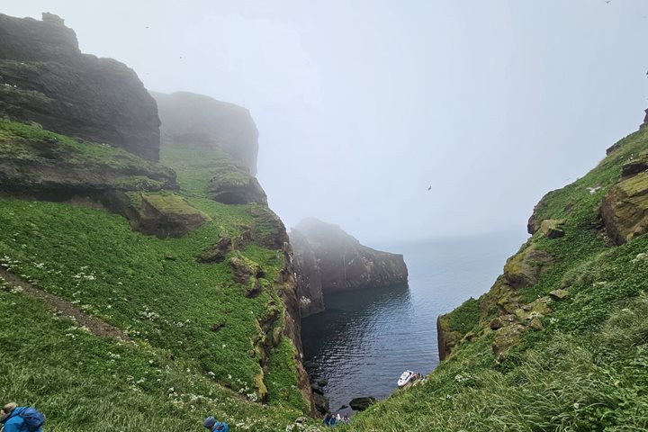 With memories of wonderful Reykjavik’s welcome still fresh in our minds, we took our coffee with a splash into the Arctic Circle as we rounded Iceland’s Westfjords to our day’s destination. A few dolphins and minke whales checked in on us, alongside our ever-present escort of fulmars, as Certified Photo Instructor Brooke Juhala readied us to capture the forthcoming spectacular landscapes. Soon enough, the gorgeous scenery surrounding Djúpavík came into view—maybe some National Geographic Expedition Adventurers recognized this place from when Superman went looking for Aquaman on a recent world-saving mission.