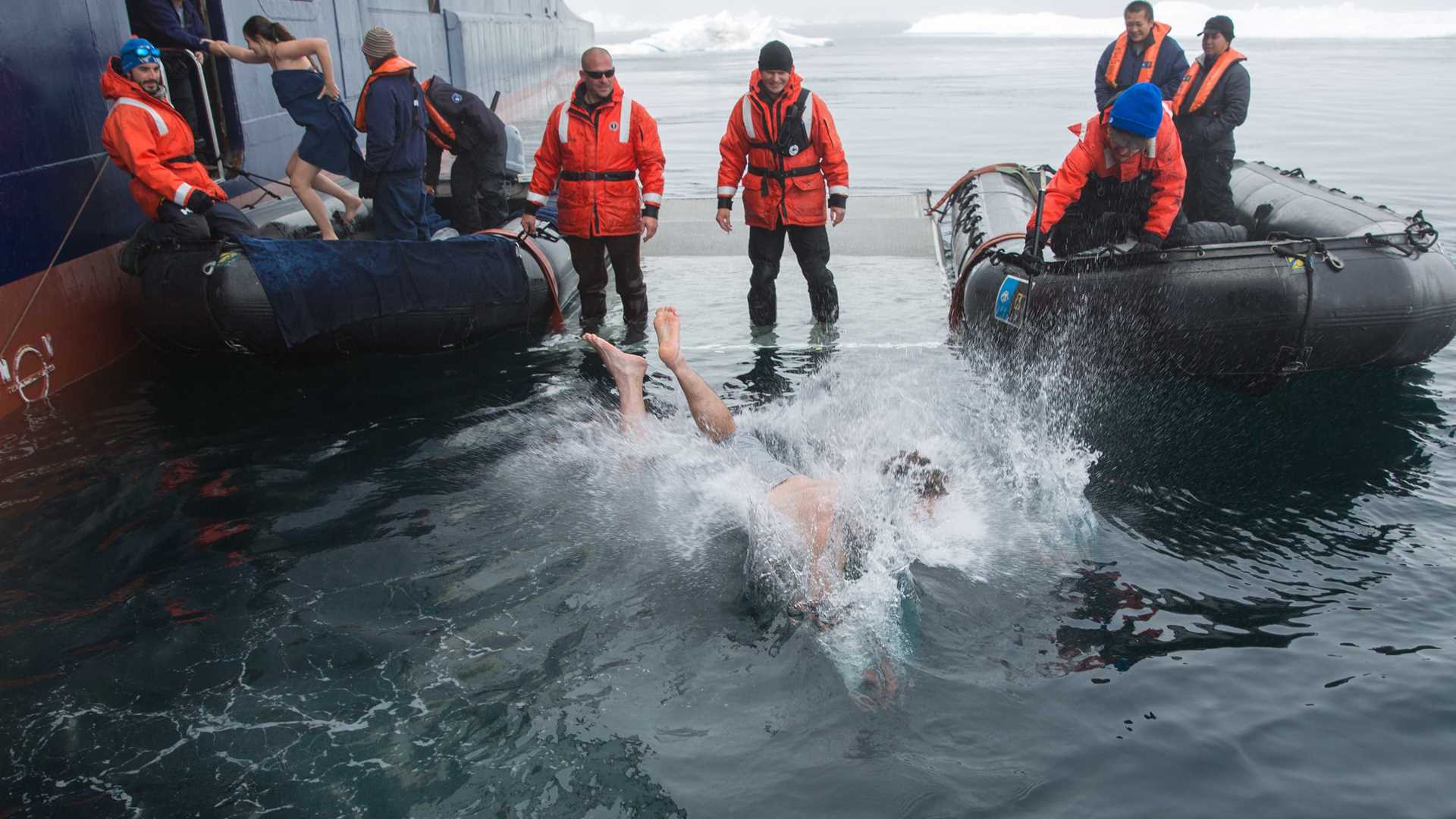 Just before we headed for Iceland, the marine radios came to life with a sqwark! Orders were given, cranes were manned and our expedition leader announced over the PA system: “We are going to give you a chance to take part in a real Arctic polar plunge, surrounded by ice!”