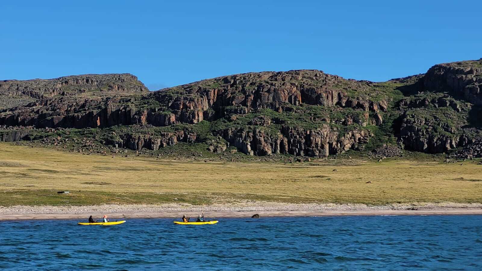We were greeted by a beautifully sunny morning, a nice change from yesterday’s drizzle. As the weather was so lovely, expedition leader Stefano offered us the opportunity to kayak. And what an opportunity it was to kayak in a sheltered bay surrounded by spectacular basalt columns! After kayaking, the brave ones jumped into the icy waters of the Northwest Passage for a refreshing dip.