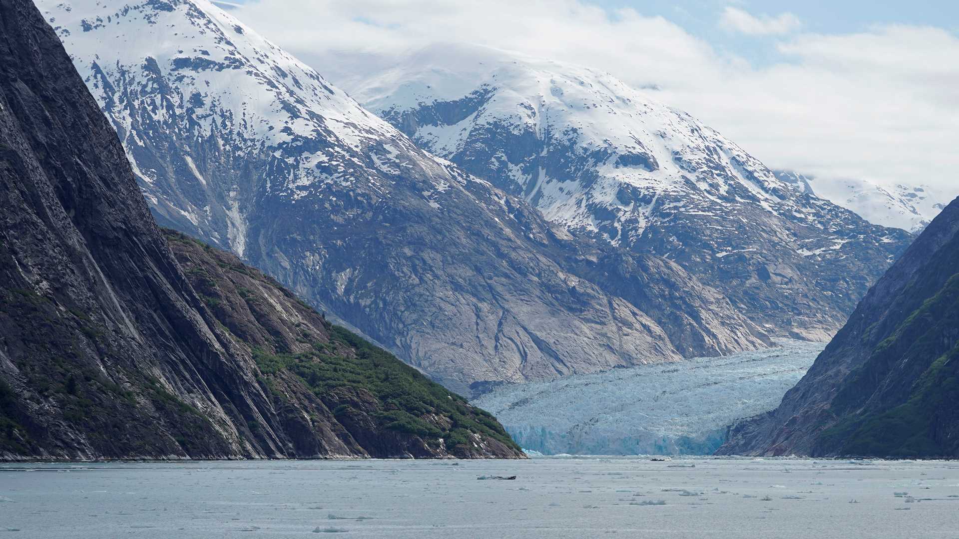 Early in the morning National Geographic Venture sailed into Holkham Bay, and made a turn into the Endicott Arm in the Tracy Arm-Fords Terror Wilderness area. We sailed up and into Fords Terror, taking in the beautiful scenery and sheer cliff walls of this part of the fjord. A black bear was spotted near a waterfall and after eating a bit on the shore, it began to climb the seemingly impossible steep cliffs with ease. After lunch National Geographic Venture was positioned with a distant view of the Dawes Glacier, and everyone set out for a Zodiac tour through the ice that had calved off the face in the past few days. We saw harbor seals on the ice at a distance, and a few swimming in the water. The weather was ever changing, and there was some pelting rain, but everyone had a great time in the midst of all the stunning wilderness.