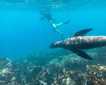 In the morning we explored the turquoise waters and white sandy beaches of Gardner Bay, where a big colony of Galapagos sea lions were basking under the warm equatorial sun. We disembarked on the beach to explore further. It really is a great experience to sit close to sea lions and be part of their lives, to understand their social structure and how they communicate with each other. We also explored the coastline by kayaking and snorkeling. Snorkeling here is a fantastic activity; playing among sea lions, tropical fish, and other marine creatures is certainly one of the greatest experiences of our trip. Then the greatest gift of our day was the unexpected whale show: a big mother humpback whale and her calf came very close to the beach in shallow waters. To have them so close was a memorable experience.