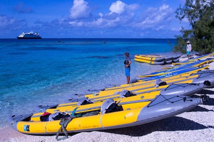 After a brilliant day on the Island of Faaite and enjoying the beauty of her lagoon, it was a grand sight to see our ship basking in the glory of the setting Polynesian sun to the west. Ahhhhh, another great day of expedition….Cheers!
