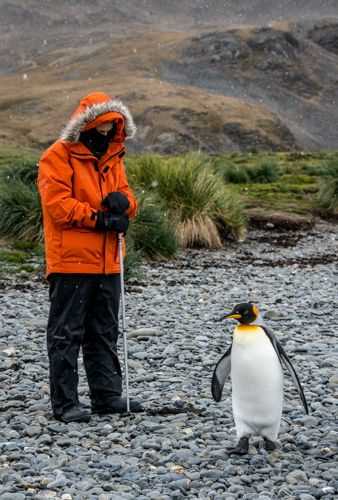 Following an early breakfast, we got to shore by Zodiac, where we were greeted by king penguins and an adorable troupe of baby fur seals. You could have sat at the landing site for hours, just photographing and watching the antics of these penguins and seal pups, which some were sure to do. For those of us who ventured further afield, a one-mile stroll led us along a rocky beach of penguins flopping into the water and rocketing out with the surf. There were even a couple of gentoo and chinstrap penguins, giving us no less than three species to view side by side. Here the king penguins dominated, however. The local colony is home to several thousand individuals.