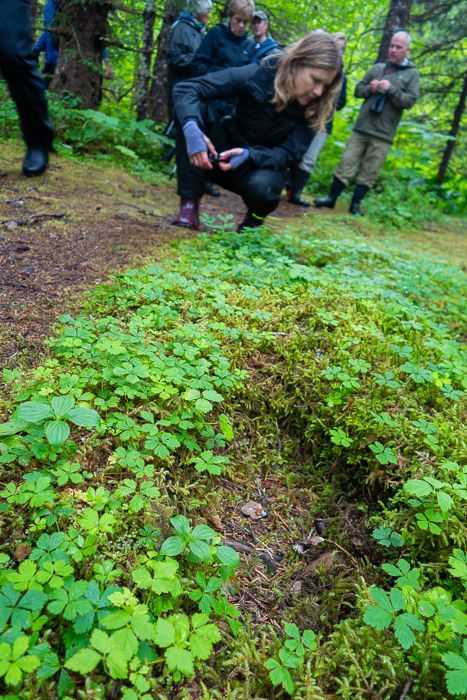 By hiking in this diverse area, we were able to start in the exposed upper tidal zone covered in thick sheets of ribbon and bull kelp, painted anemones, blue mussels, limpets, sea stars and many other invertebrates, then cross through untamed wildflower meadows into a verdant temperate rainforest. While in the forest, we found a set of bear tracks that were certainly extraordinary. The tracks were permanently depressed into the moss with the forest and repeatedly used by different bears for many years. These “perennial bear tracks” can occasionally be found at trail junctions and leave scent-marks which can share individual identity, sex, reproductive status and more. A rare find!