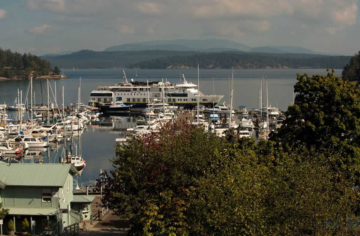 We awoke to a beautiful sunrise with fog in Friday Harbor. Soft light filtered in through the east, while the rest of the horizon was clear, welcoming the warmth of the sun. Friday Harbor is the one “real” town in the San Juan Islands. It’s a quaint, picturesque little town that rambles up the hillside from a protected harbor. A foghorn rumbled and a Washington state car ferry appeared out of the fog and into the harbor. It docked and released its cars and passengers into the town. There are 172 islands in the San Juan Archipelago, yet only four have Washington state ferry service. This town is also home to the Whale Museum, the only museum in the world dedicated to killer whales. Our resident fish eating coastal orcas are the most studied whales in the world, and in this museum everything about them can be found depicted in videos, displays, and explained by knowledgeable docents. Most of the our passengers headed to the Whale Museum to learn more about these intriguing whales that we had sighted two days earlier.