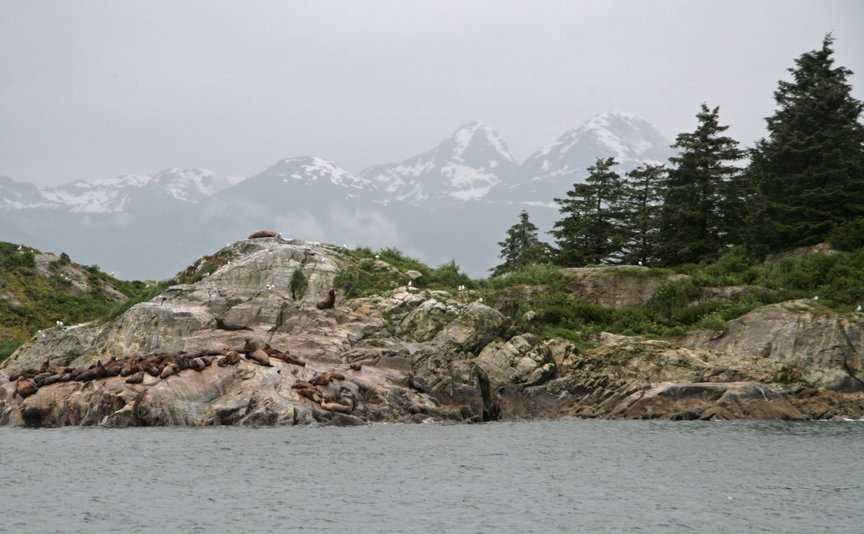 Gloomy Knob was true to its name, shrouded in mist. We watched a mountain goat nanny with a very tiny kid, probably just days old. We delighted in watching the young animal nurse, then bounce repeatedly into the air. As we gazed up at mountain goats, a humpback whale swam past.