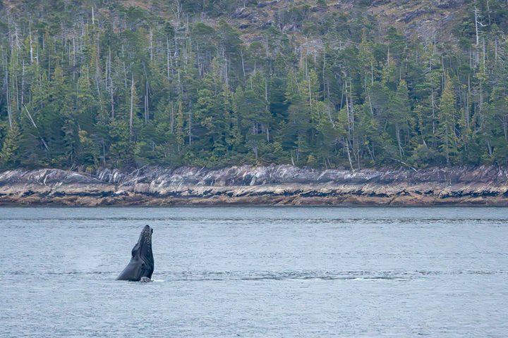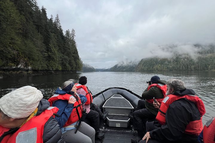 After a slurry of sunshine, we awoke to our first rainy morning in five days. The cool gray mist was a welcome change and gave us all an opportunity to use the rain gear we packed. Navigating through the narrow channel of a salmon stream, we saw several juvenile and adult bald eagles. Immature eagles are mottled brown in color, until they develop their distinctive white head and tail at the age of five. The rain stopped just in time for our afternoon hikes. Time on land allowed guests of all abilities to explore the mossy wonderland and greenery of the Great Bear Rainforest.