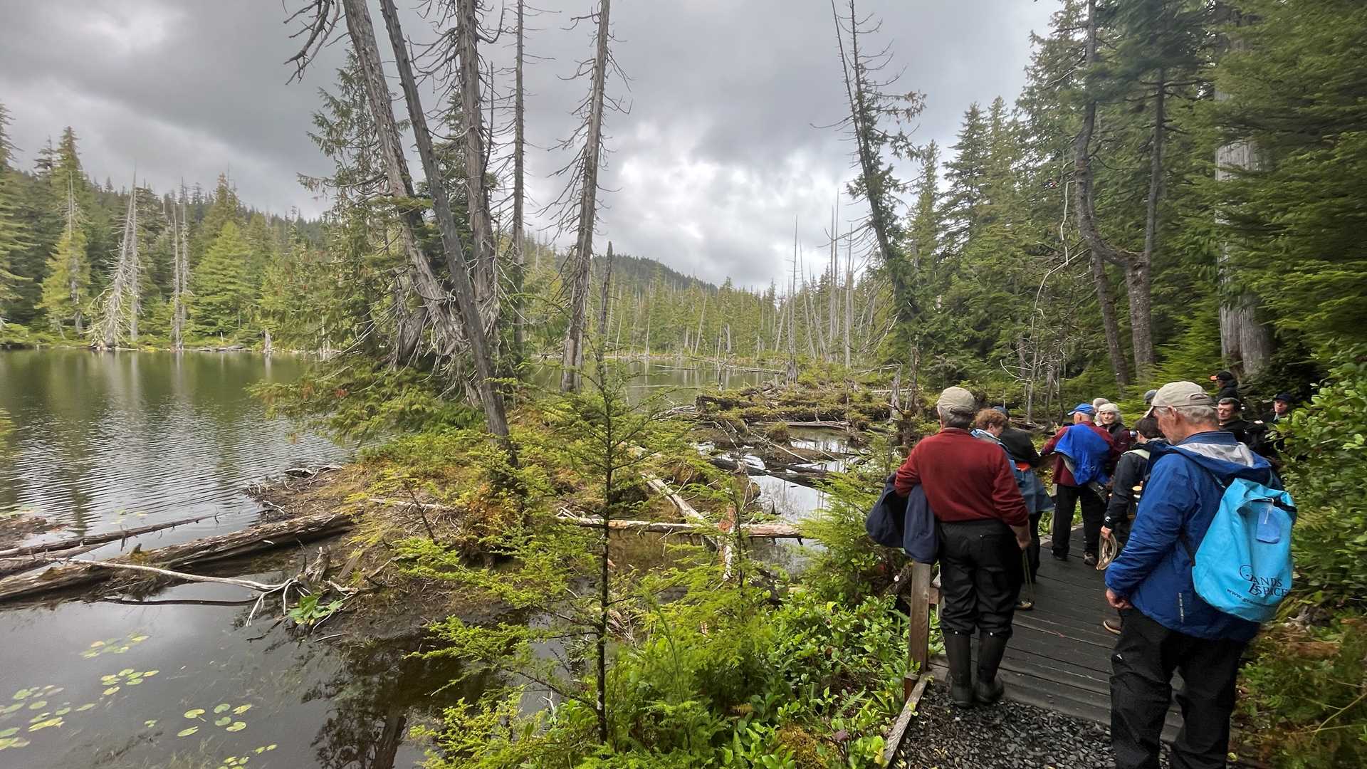 After a satisfying lunch we ventured to Spirit Lake, where the majesty of the local temperate rainforest unfolded before our eyes. Some of us chose to embark on a journey of discovery, where they learned about the diverse species of flora and fauna that make their homes in this ancient forest. Others had the privilege of joining Linda, or Gaajiiaawa, on an educational walk. As she shared her wisdom, we were introduced to the medicinal and culturally significant plants that have sustained the Haida people for generations. It was a unique opportunity to witness the profound interplay between nature and culture in Haida Gwaii.