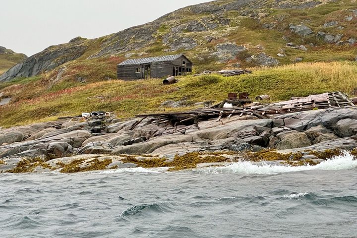 This morning we arrived at Hebron Bay with dense fog covering the coastline. It was a stark contrast to the beautiful weather of yesterday, but appropriately underscored the heavy context of the former settlement of Hebron which we were here to visit. After the area was scouted, the first ten guests arrived onshore, but only spent about 5 minutes there, as a polar bear was spotted down the shore a bit. The staff quickly and efficiently got everyone back to National Geographic Explorer, and we went out on Zodiacs instead to watch the bear as he (we believe it was a young male) ambled along the coast away from Hebron, gorging on blueberries.