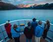 We’d come across a group of cooperatively feeding humpbacks, a behavior called bubblenet feeding. Synchronized, the whales dive below a school of herring, a couple whales blow curtains of bubbles to herd the frightened herring into a ball, a couple whales swim around flashing the undersides of their pectoral fins to keep the herring knotted together and a whale trumpets a feeding call from below. All together the group swims up through the bubblenet with mouth gaping open and burst from the water with herring scattering all around. The clever gulls signal when the surface feeding is imminent by flying in squawking and squabbling, waiting to pick up a free meal from their marine companions. The whales bubblenetted for hours, keeping people squealing in delight with shutters clicking incessantly. The stewards managed to herd most people into the dining room before their breakfast got cold, and even while we were gobbling our food before hitting the decks again, the whale team launched out of the water right beside the dining room windows. As if this weren’t enough, a whale came over to the ship, rolled on its side directly beneath the bow and rested near the surface alongside us. It was humbling to see how huge the whales are and feel wonderfully involved in the feeding process.