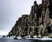 Our first exploration of the beautiful Kimberley Coast took us several miles up the lower reaches of the King George River in Zodiacs. We cruised between long ranges of glowing orange sandstone cliffs to the magnificent double waterfall at the head of the gorge. A month after the end of the rainy season, the falls still had quite a good flow. They thundered down on the east side with just enough light on the western drop that we could duck the Zodiacs in and give those who wanted one a nice refreshing shower.
