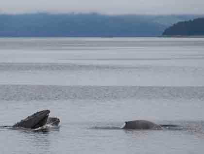 Our day started very early today in a spectacular way. Long before breakfast, we encountered several humpback whales congregated over a large area, very active at the surface. We were able to see whales in all directions, far and close. But the ones that got most of our attention were a female and her calf. The young one, presumably born just a few months ago in the warm and clear waters of the Hawaiian Islands, was very active swimming all around the place and surfacing all excited many times. He even rolled on his side a few times showing his long pectoral fin! His mom was also pretty active, but she was all business: after a long migration of several months to the tropics to give birth to her calf, during which she fasted, now she is hungry. Back in the cold productive waters of Southeast Alaska, she wastes no time in getting back into shape and this morning she regaled us many times with great views of her huge mouth as she fed at the surface. Every few minutes she broke the calm waters with her mouth wide open, showing the baleen inside, to engulf several tons of seawater together with prey—possibly herring. We watched her in awe for a long time and eventually headed towards our morning destination at Lake Eva.