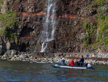 Our Zodiac skims the surface without a single bounce, slicing the sea like a flying fish, taking us toward the broken wall of rock before us. The water is so unbelievably clear, it’s like gazing through a bottle of Bombay Sapphire.