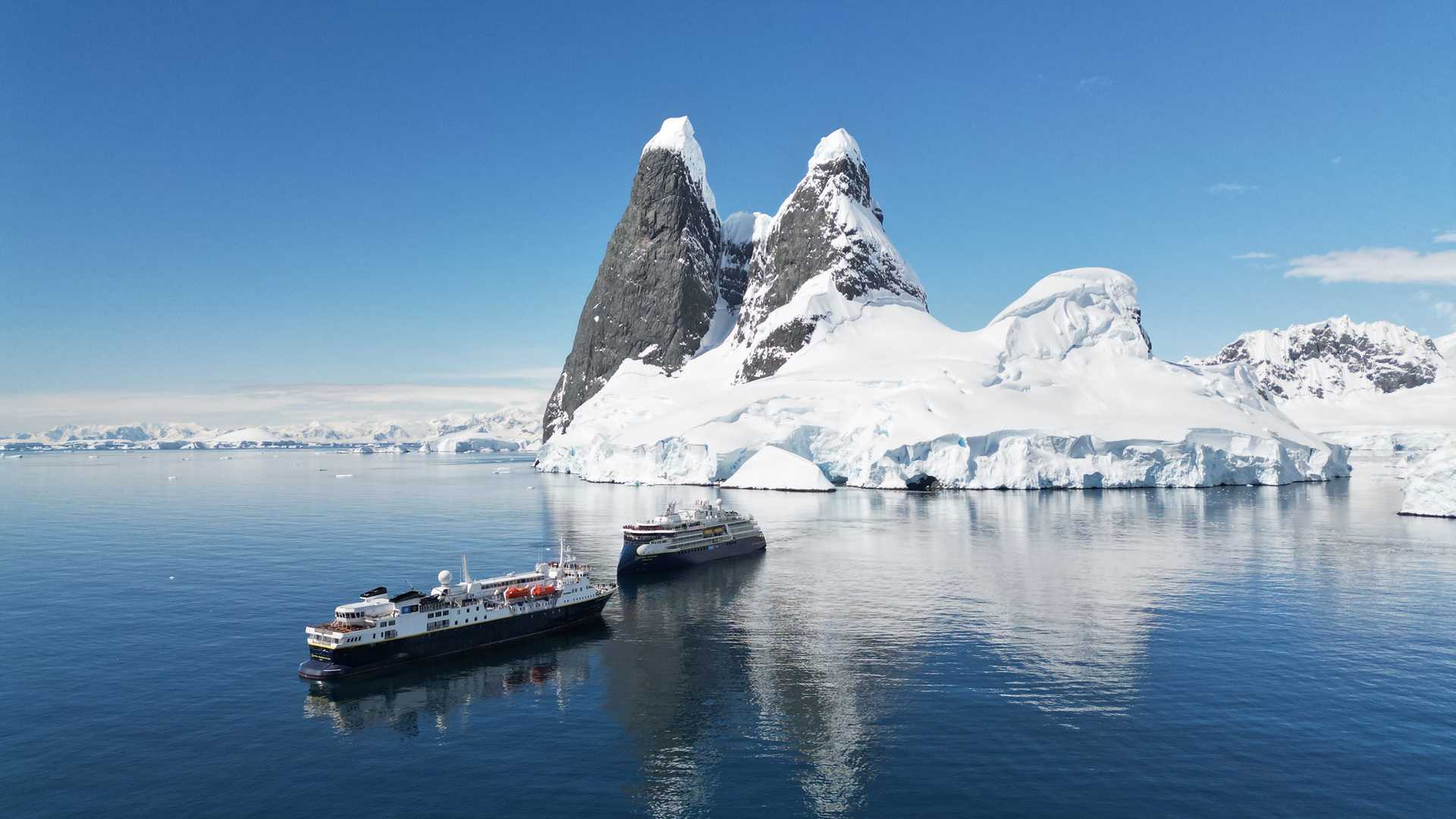 Icebergs on the horizon signaled our arrival in Antarctica. Our guests enjoyed blue skies and the mirrored reflections of icebergs and mountains in the glassy water as we cruised the legendary Lemaire Channel. We had a chance to wave to our friends as they passed by on National Geographic Explorer…as you do in Antarctica.