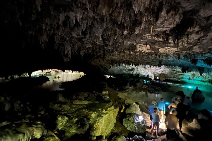 Today Makatea stands as a monument to millions of years of reef deposition. Heavy tropical downpours have slowly dissolved Makatea into a lunar landscape with cracks, fissures, and mysterious caverns. Intrepid Polynesian explorers ultimately discovered pools of potable water in a subterranean aquifer known today as the Grotto. This deep limestone labyrinth is filled with shimmering crystal calcite flowstone. Modern explorers from National Geographic Orion took advantage of the subterranean pools and enjoyed a refreshing swim on a warm, tropical day.