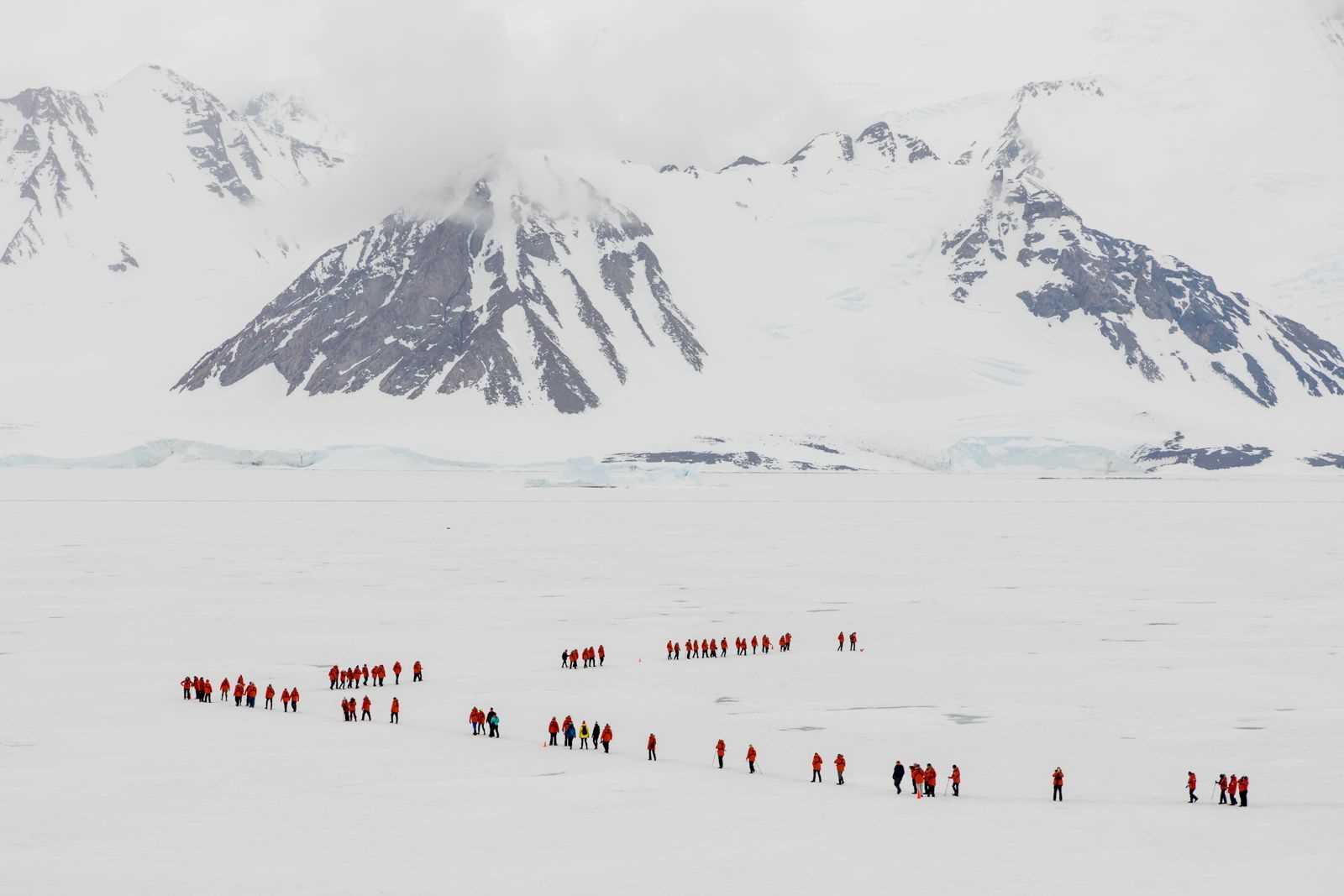 The south end of the bay is bounded by Pourquoi Pas Island, named during the first decade of the last century by French explorer Jean-Baptiste Charcot who mapped and named many of the topographical features along this section of the coast. Wedged between a tidewater glacier and a vertical cliff in a large bay on this island lays a relatively flat shingle beach which is home to a couple of Adélie penguin rookeries and a number of attending skua families. This beach was chosen for our morning’s landing operation. While half of us went ashore to become acquainted with these purely Antarctic penguins and/or hike up to the edge of the glacier, the rest were taken by Zodiac farther into the bay to get a close-up view of the glaciers and take in the spectacular surrounding landscape. After a while the two groups swapped places to finish out the morning before returning to the ship for lunch.