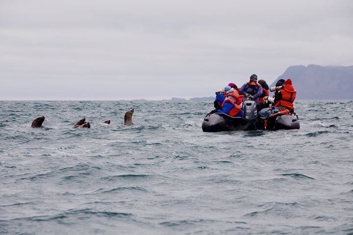 Last night we experienced some waves as we crossed Hecate Strait, but by daybreak, we were in the protected waters of Alaska’s Misty Fjords National Monument. During the morning, we saw many marine mammals –energetic Dall’s porpoises, humpback whales, and killer whales! We cruised deep into Misty Fjords, past dramatic rock cliffs smoothed by glaciers, several waterfalls, and forested fjord walls. In the afternoon, we boarded expedition landing craft, and we cruised right along the edges of the innermost bay.