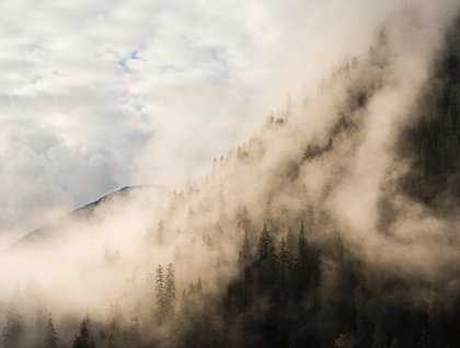 Down at the creek, mist begins to rise from the water to meet more robust clouds that move through the valleys and across the fjord. Huge spruce trees become ghosts that haunt the hills and peek out above ridges. Small flocks of chestnut-backed chickadees begin their morning forage, moving between the lower trees and shrubs, eating insects off of damp leaves and searching for pine cones with delicious seeds inside. The seeds that don’t get consumed fall to the ground, left to germinate and begin life as another tree.