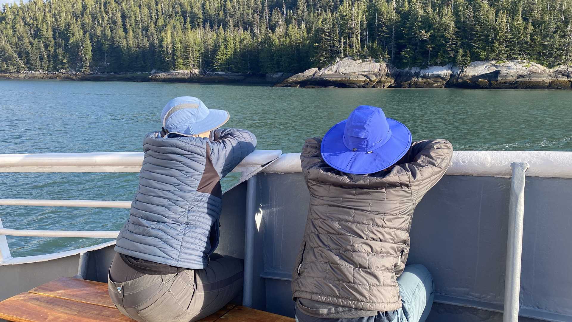 Spectacularly sunny weather greeted us again for the fourth day in a row on our southbound voyage from Juneau to Ketchikan. Today we are in Misty Fjords National Monument, and the weather brought out smiles all around the ship. Anne Marie led a wonderful morning stretch on the true sun deck as early risers scanned the shoreline for early morning signs of wildlife. Their tenacity paid off, as we spotted a coastal brown bear in a shady meadow and watched with excitement until breakfast.
