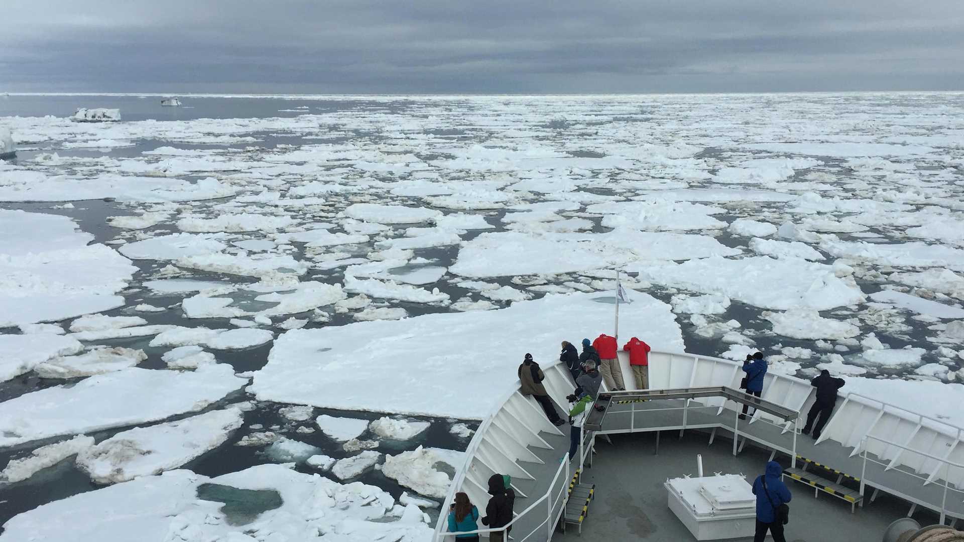 The early risers came up to the bridge as National Geographic Explorer was cruising northwards along the east side of Edgeøya. The weather was calm and slightly overcast. We were in open water of the Olgastretet (“the Olga Strait”), searching for sea ice. A few flocks of Brünnich´s guillemots and single fulmars were seen now and then. But would there be sea ice ahead? Just before seven o´clock we encountered the first ice, and telescopes and dozens of binoculars were raised in search of white, furry things and other wildlife connected to ice.