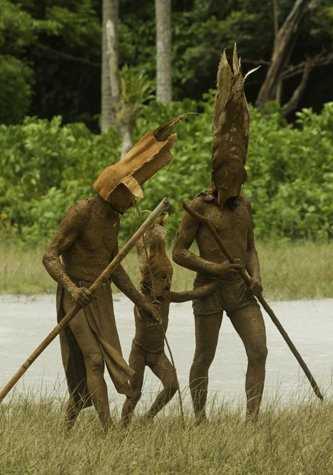 Upon landing we were treated to a typical Melanesian “threat welcome.” Ferocious warriors rushed out of the palms to confront us and, having determined that our intentions were friendly, withdrew again. Now we could walk up the beach to meet the rest of the villagers, strolling past flower-decked poles and woven palm decorations before receiving beautiful leis that made our welcome complete.