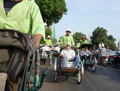 As the April heat is already building, we board a long line of “cyclopousses,” Khmer-style rickshaws in which one sits in front of the driver. In the morning traffic of Phnom Penh, this can be exciting, as our drivers frequently ignore lanes to make their way through the heavy traffic of Sisowath Quay in the direction of the palace and government buildings to the south.