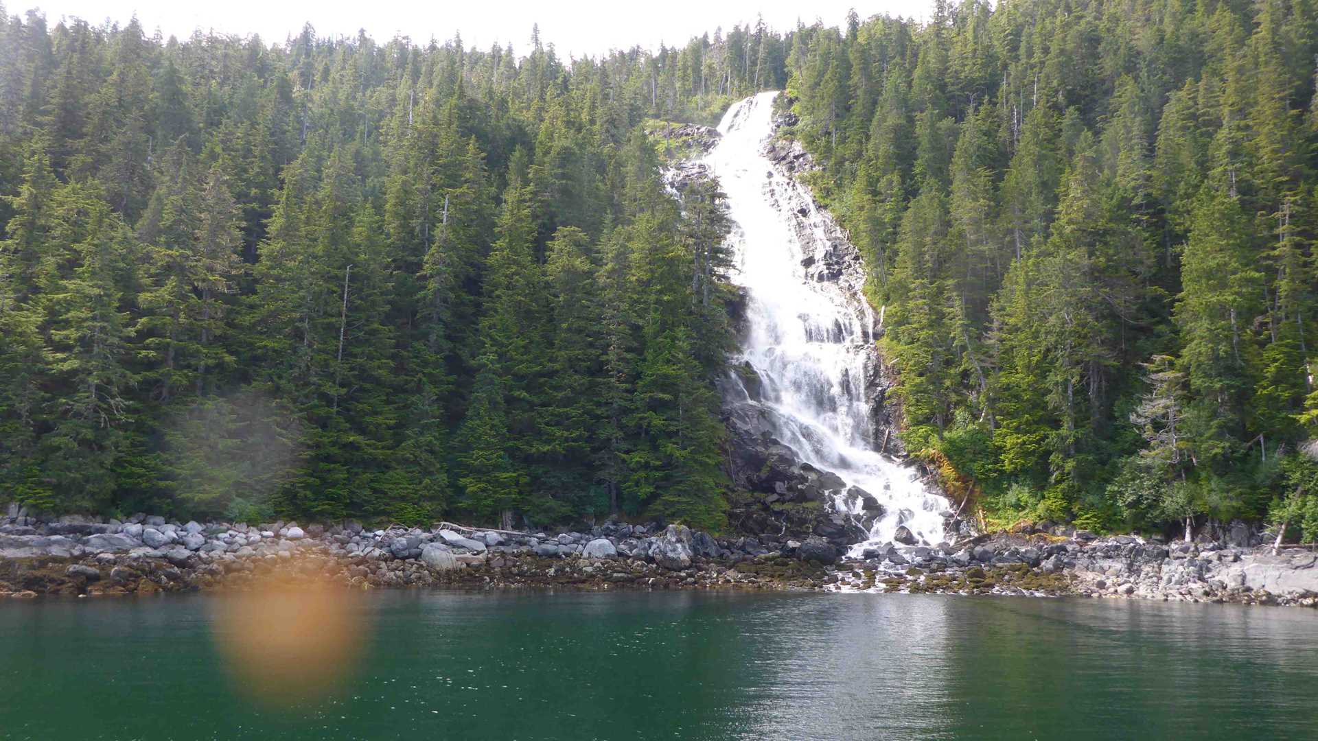 It made a fine prelude to our late-morning visit from Dr. Andy Szabo, director of the Alaska Whale Foundation, who spoke eloquently about the complexity and culture of this beautiful species. Just ahead was the narrow entrance to Red Bluff Bay, starkly heralded by the eponymous red bluff–barren rock surrounded by millions of acres of forest. The ultramafic rock, so rich in iron (hence the red color) and magnesium, creates poor soils and supports only meager plant growth. Inside the bay though, life could not have been richer, and we approached and admired a waterfall pouring down the mountainside.