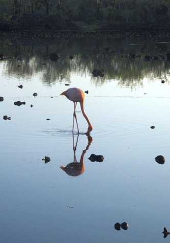 We were already anchored at Cerro Dragon, north of Santa Cruz Island, when morning broke. The skies were clear, the waters calm and the moon was still up in the sky as we approached the landing spot for our pre-breakfast visit. We began our walk and just a short while afterwards we found a small lagoon of brackish waters. It was surrounded by a landscape of incense trees and prickly pears, and soon we discovered that three greater flamingos were there, filtering the muddy waters with their beaks. In the morning light this was a sublime scene. We then moved further inland; Cerro Dragon is famous for being the home to a small population of the endangered land iguanas. The morning sunshine had already started to warm up the ground, so many iguanas had already emerged from their nocturnal hideout places and were basking in the sun. From the top of the hill we could see both the highlands of Santa Cruz other islands in the vicinity.