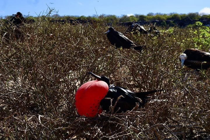 This visitor site is also home of white sand beaches, forests of giant prickly pear cacti and incense trees and a small lagoon where often, like today, we encounter shore birds, such as whimbrels, stilts, white checked pintail ducks and flamingos. The trail here took us along the brackish lagoon and then inland into the land iguana territory. The terrain was rocky and the vegetation was very dry, it was hot and humid, but we were able to spot five land iguanas, some were resting while others were in the shade and a couple were trying to feed on the cactus. Amazing to see how these animals adapted perfectly to this very dry and difficult environment.