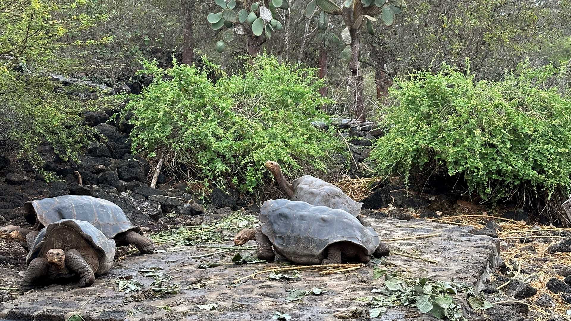 Midday, we reached El Manzanillo Ranch, a typical restaurant located in the highlands of Santa Cruz, where we enjoyed a delicious lunch surrounded by green landscape. The area is home to giant tortoises that walk freely through the territory. During our walk, tortoises of different sizes were resting or eating vegetation without hesitation despite the presence of humans.