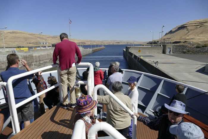 We began the morning on the Columbia River, but soon made the turn onto the Snake River. From there we transited through both Ice Harbor and Lower Monumental Dams before the crew served us lunch on the upper deck. The afternoon allowed us views of the cliffs along the Palouse River from river level as we cruised by in our landing crafts and kayaks. We also traveled by coach to the overlook to view the 180-foot Palouse Falls, and some of us hiked along a path to see the falls from different angles.