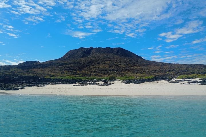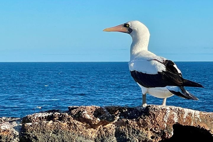 The sun was rising and the guests of National Geographic Islander II went for a hike on South Plaza Island, a fantastic small island filled with unique Galapagos species. The colors of South Plaza Island, filled with prickly pear cactus and patches of Sesuvium, a red-colored succulent plant, were beautiful at this time of the day. Galapagos sea lions playing near the rocks, marine birds flying close to cliffs looking for food, and Galapagos land iguanas waiting for the sun to rise and warm their bodies gave us the perfect scenarios for great pictures. After the visit, a delicious breakfast was waiting for us, and of course, recharged our energy for the kayaking adventure along the coast.