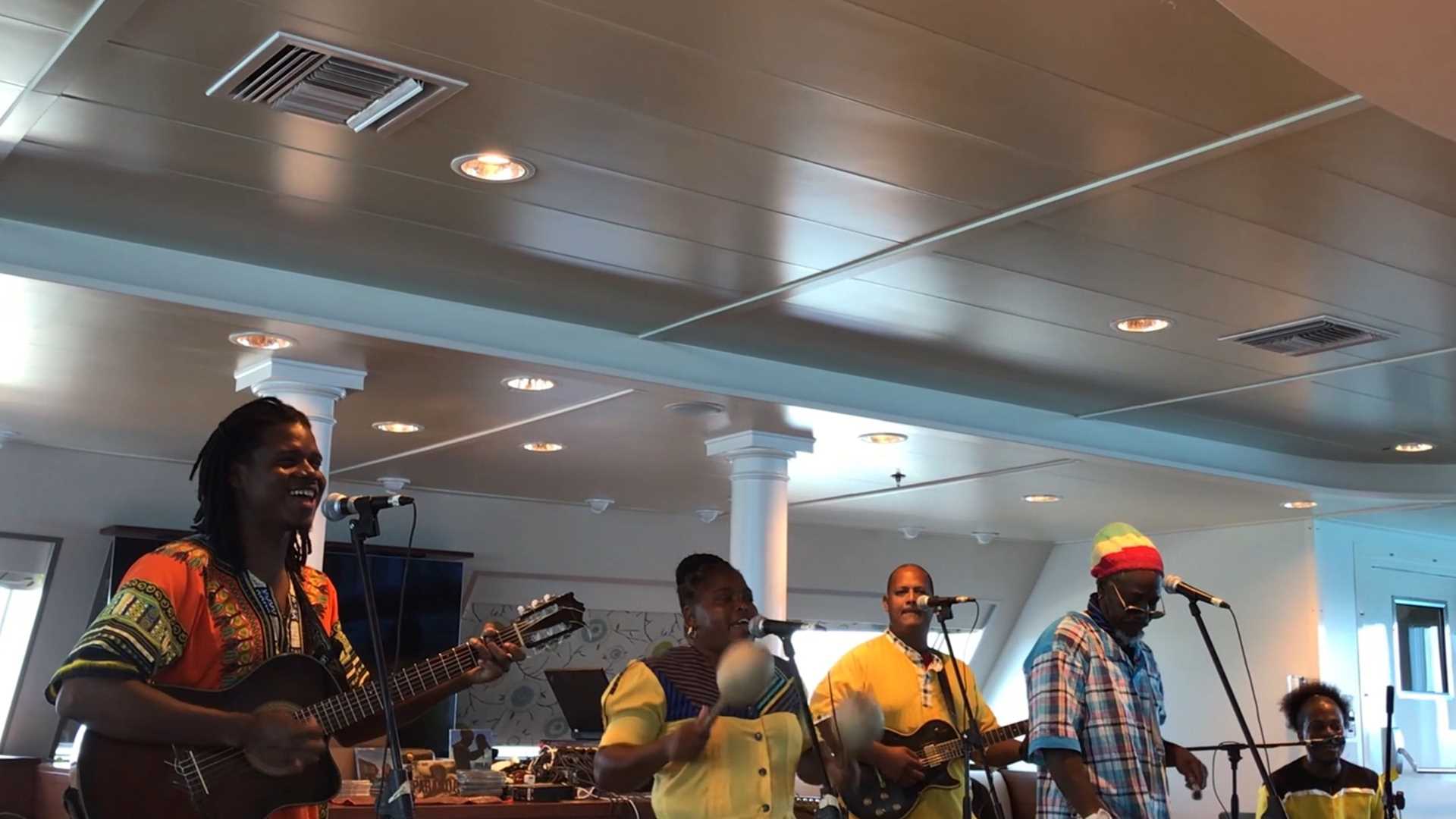 Salty and tanned by the sun, we headed back to the ship to refuel with lunch and a buffet of desserts. But after lunch was the real treat – the Garifuna Collective joined us onboard for a lively Caribbean musical session. This internationally famous, nine-member band plays many kinds of drums, maracas, guitar, and bass along with singing the traditional songs of the Garifuna people – the most authentic Caribbean music one can find.