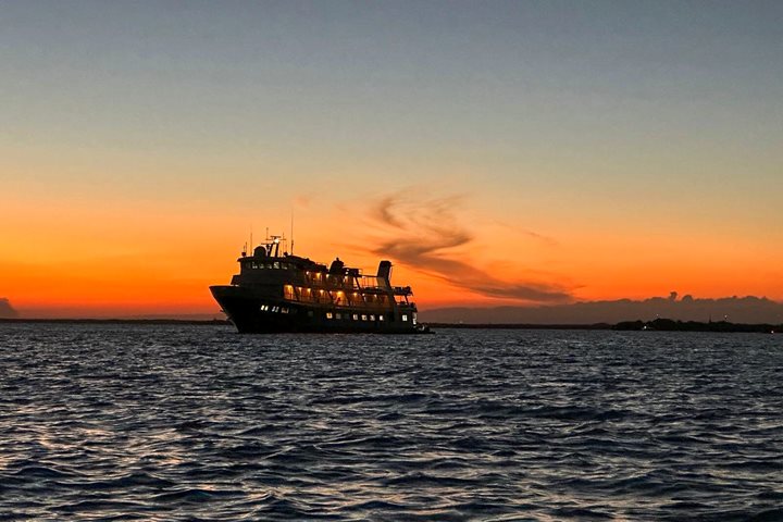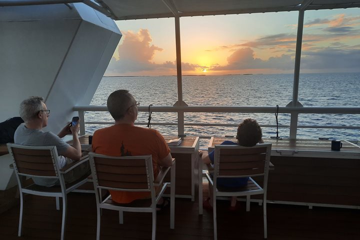 Finally, a delicious dinner closed out another perfect day on Belize’s barrier reef. After the decision of pork tenderloin, grilled local fish, and vegetarian curry for dinner the rest of the evening falls into place. All the rest happens in perfect succession: the brilliant sunset, the chocolate decadence cake, and stories of the Mayas from National Geographic Expert, Richard Hansen.