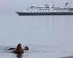 After breakfast, we maneuvered into Endicott Arm, which is a glacially-carved fjord cut into the mainland of southeast Alaska. The presence of icebergs floating in the fjord indicated that an active tidewater glacier must be nearby. The clear blue color of many of the icebergs made them look like precious gemstones and some icebergs even appeared to have been sculpted by the hand of an expert ice-carver. As we cruised up the fjord, a large brown bear was seen in the tall sedges above the high tide line, occasionally poking its furry head up to look around.