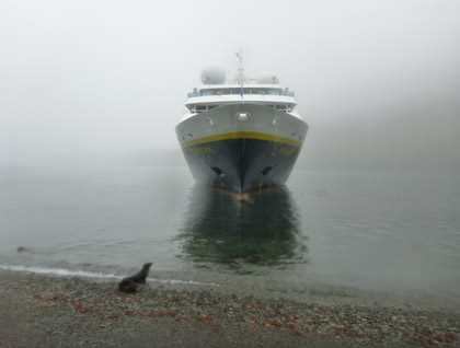 Just as breakfast was ending, National Geographic Orion cautiously entered Stromness Bay in a heavy fog. The gloom added a sense of foreboding to the scene as the ruined, crumbling buildings of the Stromness whaling station appeared as ghosts from an abandoned age. Giant, rusting propellers were scattered on the beach next to all manner of pipes and gantries and masts and boilers, twisted metal and links of chain: the legacy of the industrial revolution. Rather than risk fouling our anchor on the submerged junkyard at the bottom of the bay, our captain chooses to simply push the ship’s bow right up to the landing beach!