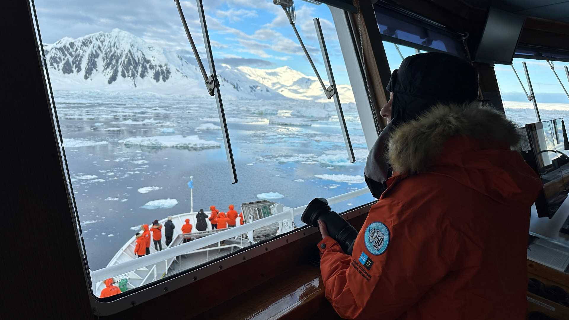 We woke to glassy calm waters and white as far as the eye could see, both on land and in the water. Overnight we’d made our way south to the Antarctic Circle and were pushing our way through icy waters, navigating the close islands and a small passage of water called The Gullet to arrive at our afternoon location for operations. We enjoyed a peaceful morning of spotting seals and sea birds.